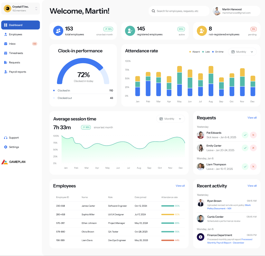Gameplan HR is a modern mobile app that helps employees manage work, payroll, and HR processes — all in one secure, intuitive platform. Designed for growing businesses, it replaces expensive, rigid HR portals with a custom-built, cost-efficient solution that simplifies everyday workflows and enhances clarity and transparency across the organization.